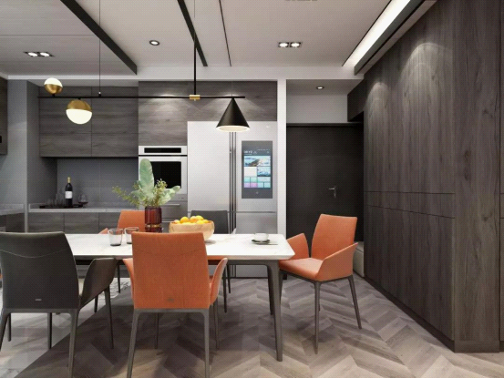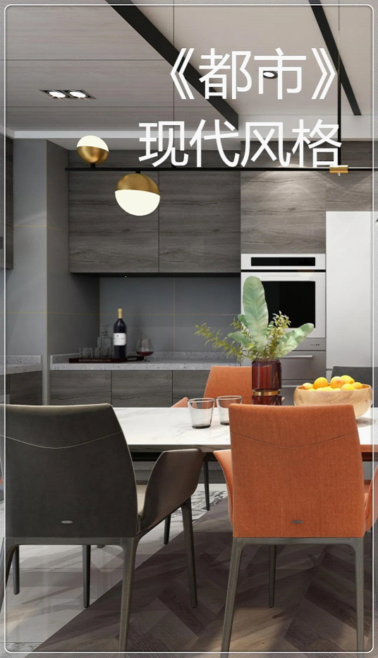 《都市》空間的主要花色為 埃拉橡木(深),中性色調的木材應用讓空間更有質感,搭配清淡的色彩和石紋讓整個空間顯得理性,不需要多余繁奢的飾品裝飾,幾幅個性掛畫,中規中矩的燈飾,就呈現出一種都市人時尚簡約的生活方式。