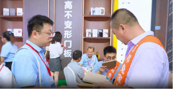 工作人員現場介紹世界蕞高不變形門板,這是板芝福家居今年的爆款產品,高達5米,一門到頂,無需拉直器,不開裂,不變形,外觀簡約又大氣。