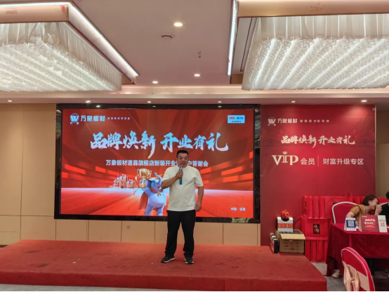 剪彩儀式后開展了答謝會。旺德府家居集團總裁助理毛寧先生擔任本次會議主持人,并向與萬象板材品牌攜手奮進的合作伙伴們表達了衷心的感謝。