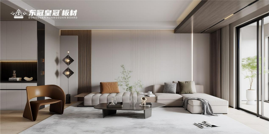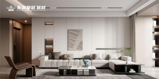 當花色雅致與品質硬核形成合力,東冠皇冠板材以空間為畫布,讓“光環”自然流淌。它從家居整體性出發,讓每塊板材與環境和諧共生。不同風格場景中,其定位精準:現代簡約客廳,淺色系板材配金屬線條,簡潔利落且細膩紋理在光影間若隱若現;新中式書房,帶天然木紋的板材與水墨呼應,山形紋、直紋等盡顯東方韻味。這種適配性源于對空間美學的理解——板材是“底色”,精心打造的紋理既顯特質,又為其他元素留空間,達成“1+1>2”的效果。