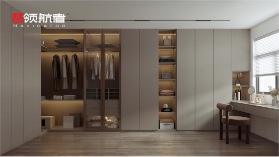 ·臥室的輕奢,是能“卸下疲憊”的溫柔休憩場。領航者家居定制的整體衣柜,柜門選“膚感啞光板”,觸感如云朵般柔和親膚。更藏著貼心定制細節:衣柜內側預留掛長衣的高區、放包包的隔層,每一處設計都提前關照生活需求,讓輕奢不止有視覺上的精致,更延伸到使用時的妥帖舒心。
