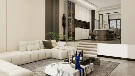 沙發背后與餐廚區定制餐邊柜采用一體化設計邏輯,通過玻璃、金屬框與同色系板材的材質呼應,以及線條的無縫延續,消弭了客廳與餐廚空間的物理割裂感。