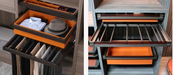 導軌也有講究。小抽屜用三節軌就夠了,輕便順滑;大抽屜、廚房柜,一定要選托底阻尼軌,承重力強,不容易出軌,放重東西也不用擔心。柜門高度超過2.4米,必須加拉直器。