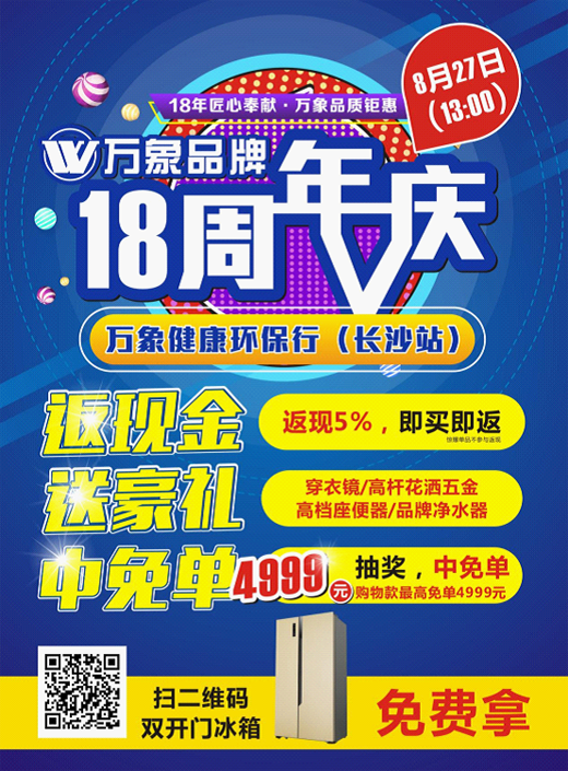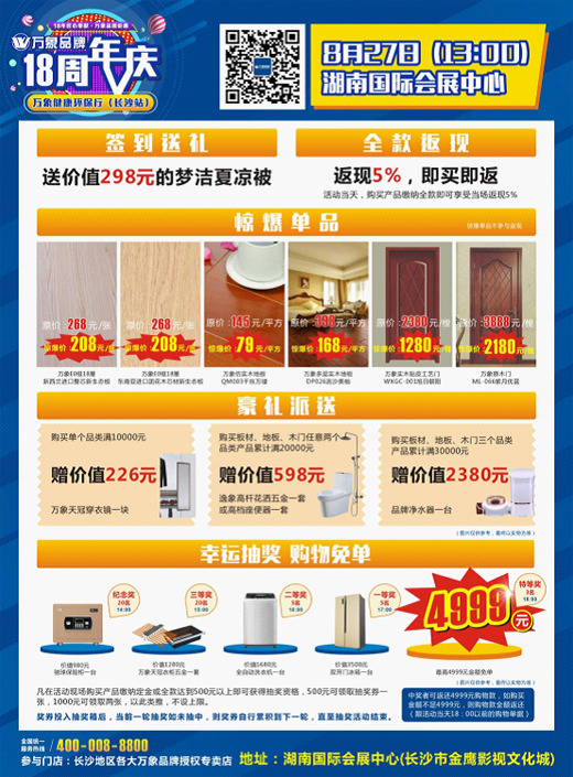 值此18周年慶典之際,萬象品牌為了感恩回饋全國新老顧客的支持與厚愛,推出“萬象品牌18周年慶·健康環保行活動”,首站定在星城長沙。以新穎獨特的主題活動、超大力度的促銷活動、史無前例的優惠力度,在星城再次掀起“鉅惠”狂潮。
