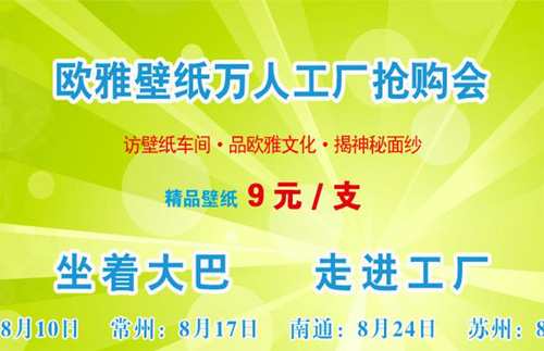 歐雅壁紙工廠搶購(gòu)會(huì)盛大開(kāi)幕,訪壁紙車(chē)間,品歐雅文化,揭神秘面紗,“史無(wú)前例”三十年歐雅首次廠團(tuán),不容錯(cuò)過(guò)的價(jià)格盛宴!精品壁紙9元每支,現(xiàn)場(chǎng)秒殺有禮品,有驚喜!