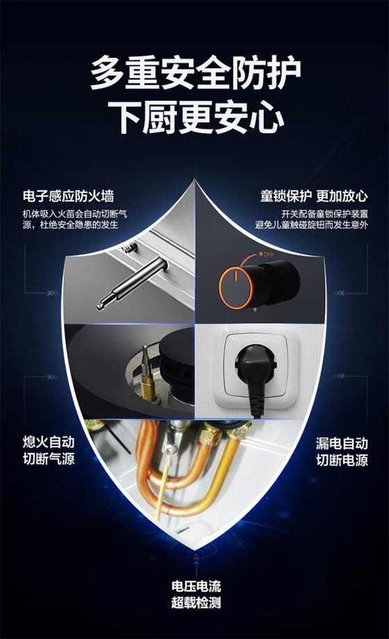 一看安全性能。一般來說,集成灶包括燃氣系統和電氣系統,當火苗意外躥進機體,或是處理不當泄漏煤氣時,就很容易引起安全隱患,危及生命健康。這款煙灶消集成灶JJZT/Y-903AX有多重安全防護,不僅有電子感應防火墻,在機體吸入火苗時自動切斷氣源,還配置了童鎖保護裝置,裝置了漏電自動切斷電源、電壓電流超載檢測等設定,可以讓用戶下廚更安心。
