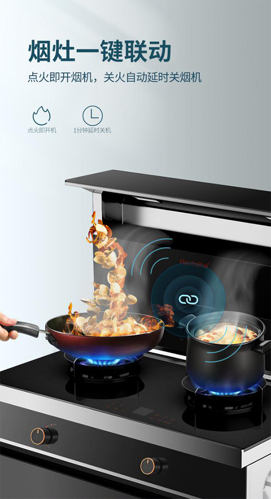 四看附加功能,比如智能聯動、清洗功能等。Haotaitai煙灶消集成灶JJZT/Y-903AX裝載了煙灶一鍵聯動,關火自動延時1分鐘關油煙機的智能設置,并添加了智清潔功能,可以智能檢測風輪及整機工作狀態,自動啟動清洗程序,讓機器自己洗自己,解放用戶雙手,提升使用體驗。