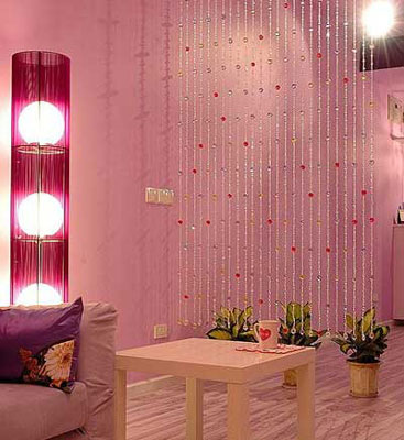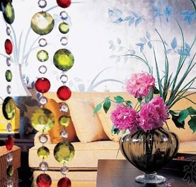 作為隔斷,珠簾的色彩與款式要與居室風(fēng)格色彩協(xié)調(diào)。例如,溫馨浪漫風(fēng)格適合粉色,紫色,款式可以使用水晶珠簾,清爽簡約風(fēng)格適合冷色的水晶珠簾,以藍(lán),白,茶色為宜,時(shí)尚感強(qiáng)的格局則適合用紅色,綠色,煙熏色等色彩明快鮮艷的珠簾搭配,但是歐美古典風(fēng)格當(dāng)然還是使用全透明的水晶最顯高貴了。