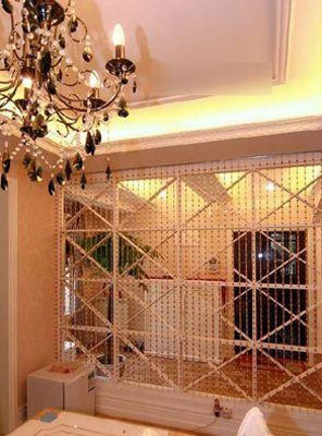 電視背景、沙發(fā)背景、床頭背景、的墻面設(shè)計(jì)都可以使用珠簾。現(xiàn)在流行的方式是現(xiàn)在墻面上裝上玻璃或者鏡面,再掛上珠簾緩和墻面的冷硬感。這樣使墻面更加溫馨靈動(dòng),視野更加開闊明亮,空間的縱深感也更強(qiáng)。在珠簾的頂端在配合使用一些射燈,當(dāng)光源打到珠簾身上可以反射出很多好看的光線來。
