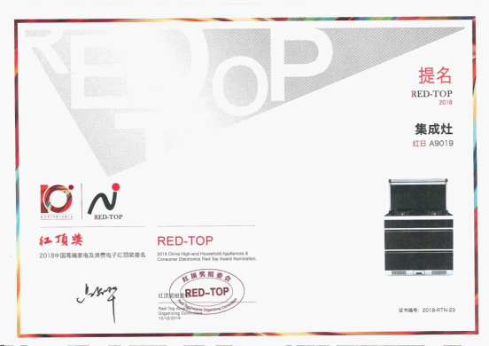 2018年12月13日,“第10屆中國高端家電趨勢發布暨紅頂獎頒獎盛典”在北京飯店金色大廳隆重舉行,來自家電產業內外的重量級代表齊聚一堂,共同見證了本屆“紅頂獎”的誕生。來自紅日廚衛的紅外線集成灶新品A9019憑借著在節能、環保等方面的優異表現,榮膺紅頂獎提名。紅日廚衛紅外線集成灶A9019是紅外線集成灶類唯一入選產品,而集成灶全行業僅三家企業入選。