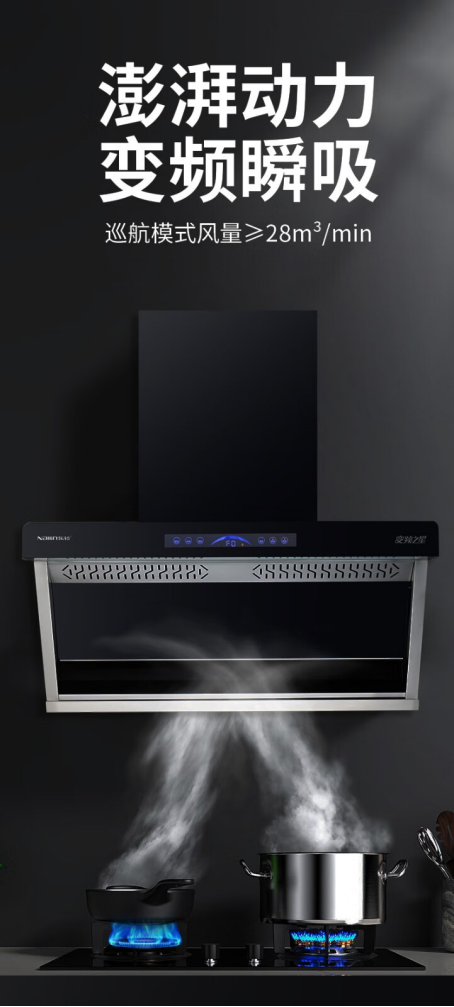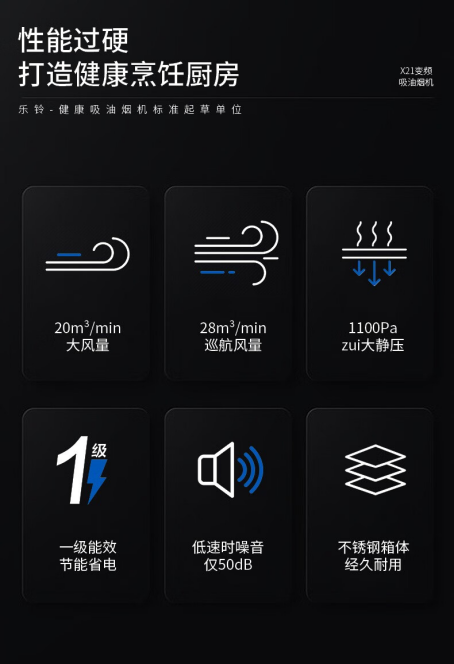 樂鈴X21變頻吸油煙機,不僅顏值高,而且具備強大性能,搭配無極變頻電機,帶來28m³/mini的強勁吸力,只要油煙一冒即可瞬間吸走,造就一個清新干凈的廚房環境,將最好的廚房空氣環境帶給為美食而用心的人。同時它還搭配了1100Pa超強風壓,快速將油煙通過公共煙道排出去,就算是炒菜的高峰期,也可以將油煙順利排出去,確保不會油煙倒灌。