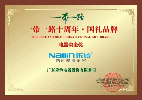 樂鈴憑借在廚房電器領域內吸油煙機和集成灶對廚房油煙難關的攻克,參與《健康吸油煙機》、《健康集成灶》等團體標準的制定,推動行業的健康升級,用技術守護億萬家庭的呼吸健康。最近,樂鈴喜訊頻傳,在“一帶一路十周年·國禮品牌”活動中,被主辦方評選為“一帶一路十周年•國禮品牌 電器類金獎”稱號!