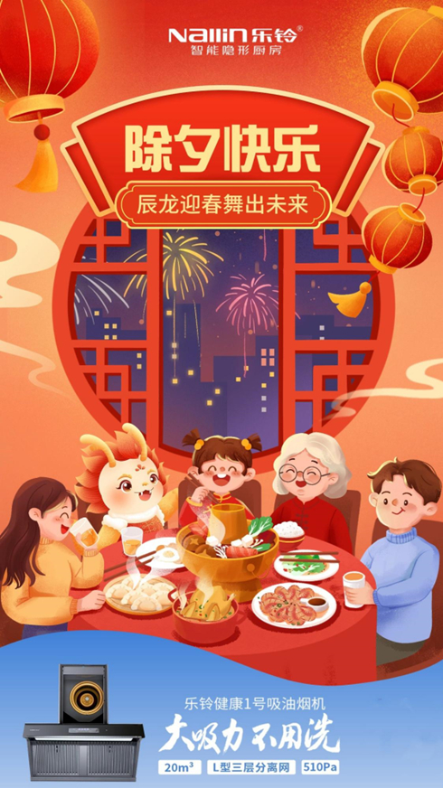 春節私宴的滿分儀式感,從樂鈴智能廚房開始。一家人坐在一起吃年夜飯,是一年中最有年味的一刻,飯菜里藏著的是人間煙火味,是親人間的思念,是一家人的幸福滋味。樂鈴廚電祝您:龍年大吉,身體健康,萬事如意,闔家安康!