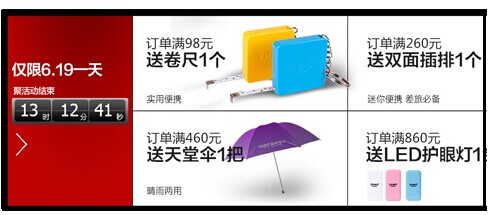 活動(dòng)僅限6.19日一天,錯(cuò)過(guò)了,就不能再用了。據(jù)悉,凡時(shí)進(jìn)店消費(fèi)者朋友訂親單滿98元即可送卷尺1個(gè);訂單滿260元,送雙面插排1個(gè);訂單滿460元,送天堂傘1把;訂單滿680元,送LED護(hù)眼燈1臺(tái)….多買(mǎi)多送,更多的優(yōu)惠等著你來(lái)取。