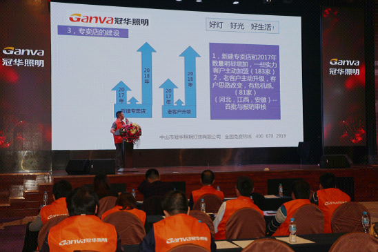 隨后,冠華照明營銷總監楊克承先生上臺圍繞《年度總結及打造2019年超級終端》進行了深入淺出的主題演講。首先,楊總帶領現場嘉賓回顧了冠華照明2018年所取得的一系列輝煌成就。其次,楊總為大家介紹了超級終端的運營模式及賣貨優勢,為各位經銷商的終端賣貨指明了清晰的方向。最后,楊總以舉例子的方式傳授了如何使用超級終端的經驗技巧,讓現場嘉賓受益匪淺。