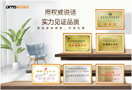 江門市龍源燈飾照明有限公司,是一家集研發設計、制造生產、銷售于一體的專業燈飾企業,東方名仕為旗下子品牌。自成立以來,東方名仕憑借新穎設計、豐富品類、卓越性能和極致性價在市場上逐步建立了良好業界口碑,被建設科技理事會任命為“副理事長單位”,被廣東省照明電器協會選為“常務理事”,并獲得“AAA級中國質量信用企業”、“中國照明燈飾行業鏡前燈領袖品牌”、“進步供應商獎”、“高新技術企業”等眾多榮譽獎項。