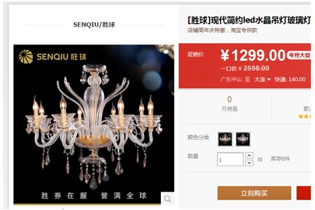 這款勝球的水晶燈原價是2598元,現在特惠價是1299元。親們趕快收藏起來吧,說不定元旦還會有意想不到的意外喔。這款產品采用意大利進口專用玻璃與出口級K9水晶至尊搭配,高檔材質與精工藝雙劍合璧,在燈的世界打造玻璃的極致之美。