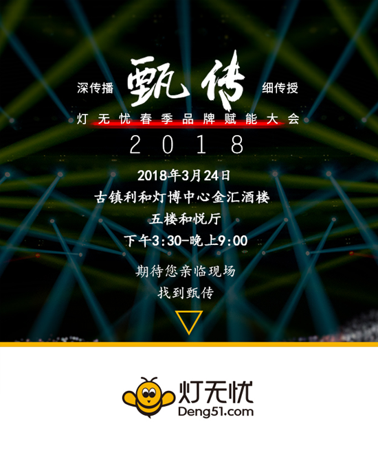煙花三月,萬象更新。在這生機勃勃的春季,燈無憂迎來2018年甄傳品牌賦能大會。根據活動內容,“優秀服務商股權認購,VR2.0云設計”等勁爆內容將引爆燈飾照明行業,此次大會將于3月24-25日在燈都古鎮利和燈博中心拉開帷幕。