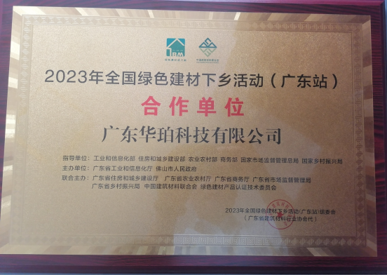 2023年3月22日上午,“綠色建材進(jìn)萬(wàn)家·美好生活共創(chuàng)建”2023全國(guó)綠色建材下鄉(xiāng)活動(dòng) (廣東站)啟動(dòng)會(huì)在佛山舉行。來(lái)自佛山的聚脲強(qiáng)企——華珀科技全面支持綠色建材下鄉(xiāng)活動(dòng),積極開展全國(guó)綠色建材領(lǐng)軍企業(yè)惠民行動(dòng),被授予“2023年全國(guó)綠色建材下鄉(xiāng)活動(dòng)(廣東站)合作單位”榮譽(yù)稱號(hào)。