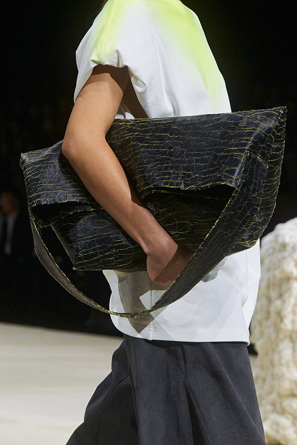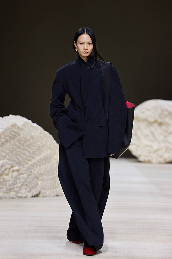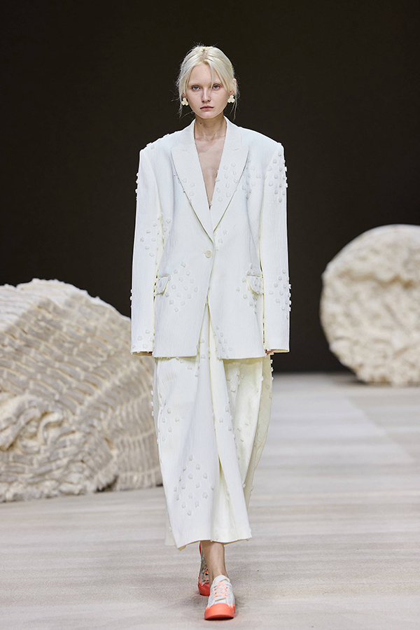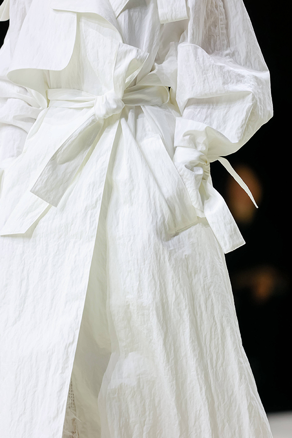 系列中大量的弧線廓形,從肩部到身體的不同部位,流暢清晰地展現(xiàn)了服裝的雕塑感與流動(dòng)性。真正能為我們帶來方向感的,正是生命的流動(dòng),它如水流般奔走涌動(dòng),遇上島嶼礁石,激起朵朵浪花,落在土里成了棉花,飄在空中成了云朵……