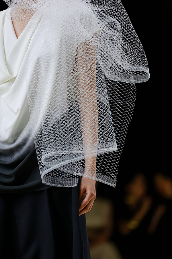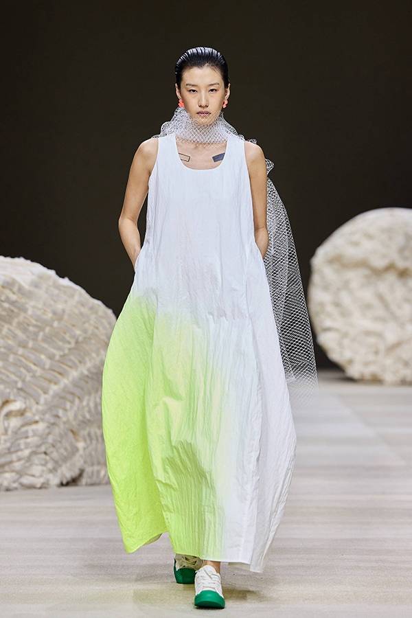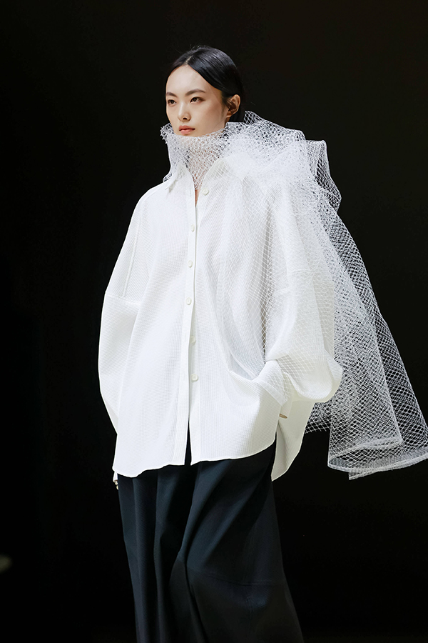 JUDYHUA以簡潔流暢的手法,將美麗的生命歷程以藝術(shù)家塑造雕塑,描繪抽象作品的方式,將衣服以軟建筑和軟雕塑的形式一一呈現(xiàn)。當(dāng)代藝術(shù)中常用的混合材料被使用于服裝,散發(fā)出獨(dú)有的藝術(shù)氣息與平實(shí)非凡的生命質(zhì)感。