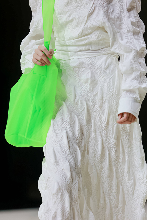 JUDYHUA通過特殊的再造面料,色彩,廓形和精湛的剪裁,輔以時(shí)裝結(jié)構(gòu)技法,帶您貼近具體而細(xì)微的事物,去觸摸根脈之上的泥土,感受清晨的微風(fēng),在熟悉的觸感中,看見生命的肌理,因?yàn)樵诿恳粋(gè)不起眼的地方總蘊(yùn)含著強(qiáng)大的生命力,它們的力量綿延在一片溫柔的沉寂中... ...