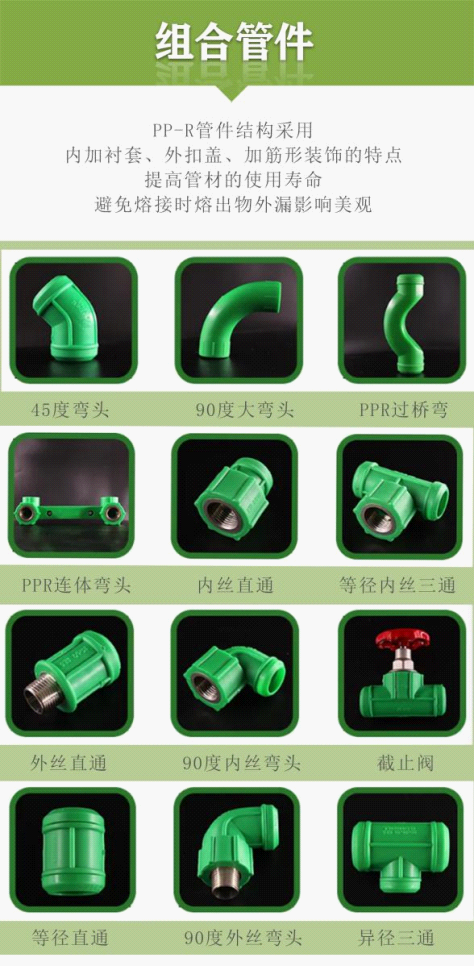PP-R管件結(jié)構(gòu)采用內(nèi)加襯套、外扣蓋、加強(qiáng)筋形裝飾的特點(diǎn),提高管材的使用壽命,避免熔接時熔出物外漏影響美觀。