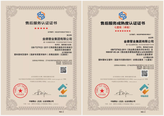 無可置疑,金德管業以赤誠之心在售后服務領域投入了大量的心血與精力。而如今其成功將售后服務“七星級”(卓越)認證證書收入囊中,也可見證其服務功能、服務網絡、服務質量、服務體系、服務標準等售后服務方面在業內實屬領先水平。因而,金德管業能廣受行業專家及權威機構的肯定,實為水到渠成!
