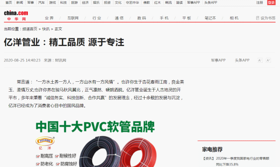 億洋管業(yè)與《新浪家居》、《中華網(wǎng)》、《今日頭條》、《搜狐網(wǎng)》、《中國(guó)品牌網(wǎng)》等數(shù)百家行業(yè)媒體達(dá)成戰(zhàn)略合作,將圍繞品牌資訊展開全年跟蹤報(bào)道,大力提升品牌的影響力。
