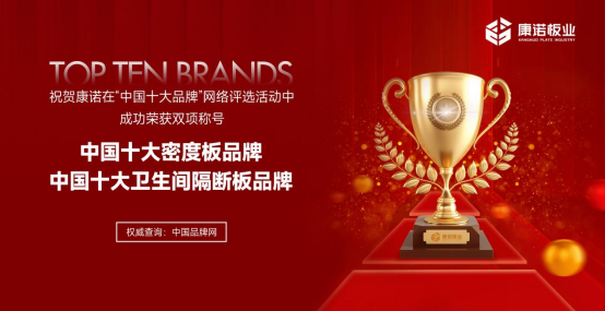 近日,由《中國品牌網》主辦、《中國建材家居網》等權威網絡媒體協辦的“中國十大品牌”全國網絡評選活動,通過嚴苛的層層評選考核,為行業評選出了品質過硬、服務優越、用戶認可的卓越品牌。其中,康諾板業力壓眾品牌,榮獲“中國十大密度板品牌”和“中國十大衛生間隔斷板品牌”兩大榮譽,成為行業熱議話題。