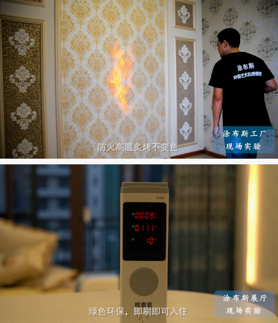 在企業宣傳片里,涂布斯藝術涂料清晰地亮出了各種權威機構的認證資料,向大眾確保其產品參數均嚴格處于國家標準范圍之內,還有“中國綠色環保產品”、“中國十大藝術涂料品牌”等榮譽為其產品質量“加冕”。此外,涂布斯藝術涂料還通過模擬實際生活場景,在“人工+工具”的基礎上進行實操試驗,以此充分說明其產品“硬度強,不懼硬物刮損”、“防火性,高溫炙烤不變色”、“防水抗霉易擦洗”、“綠色環保、即刷即可入住”等優異特性。