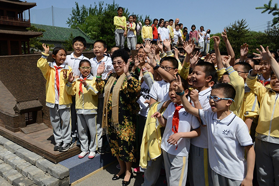 少年兒童們在博物館與陳麗華簇擁在一起