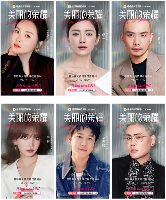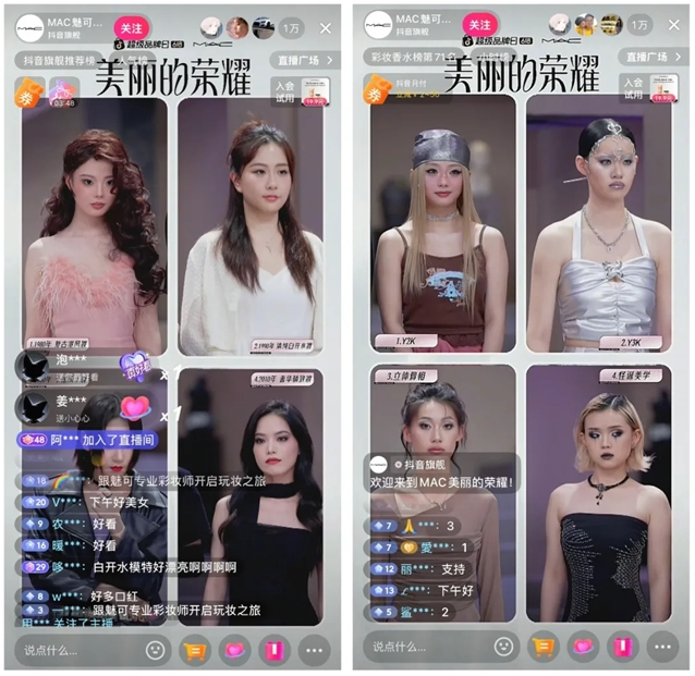 細看才知道,這別出心裁的直播形式,原來是抖音商城超級品牌日的美妝垂類 IP “ 美麗的榮耀 ” 。首期, 抖音商城超級品牌日和美妝品牌 M·A·C 魅可( MAC )合作,一起打造了本次彩妝師競技爆改秀。