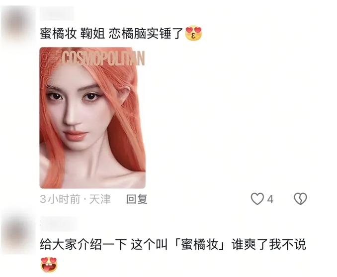 視頻發(fā)布當日, # 跟鞠婧祎用蜜橘妝打開夏天 很快登上抖音熱榜 Top 6 。評論區(qū)聽取夸聲一片, “ 鞠式美學 ” 再次在抖音站內(nèi)掀起仿妝狂潮。