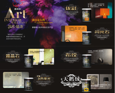 數(shù)碼彩此次立項項目-藝術(shù)·墻漆,集乳膠漆易施工,壽命長,大面積施工的特點,只用一種涂料,運用不同的涂刷工藝,可涂裝出多種藝術(shù)墻面效果,解決了行業(yè)藝術(shù)涂料施工復雜,難以大面積施工的問題。
