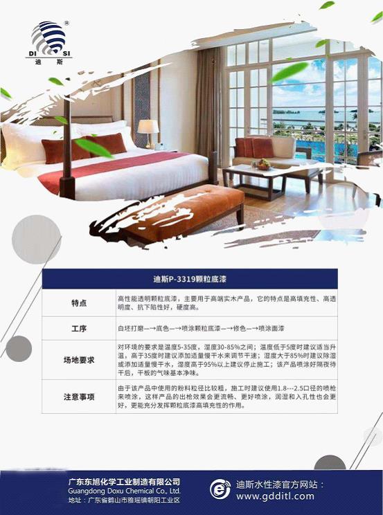 “迪斯P-3319顆粒底漆”具有非常好的填充性,兩遍底漆就可以把實木底材填充好,大大減少底漆的涂裝遍數和使用量,從而有效的縮短客戶的生產工期和生產成本,助力家具廠提高生產效率,贏得更高的經濟效益;