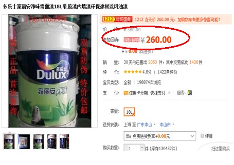 【多樂士】中國十大涂料品牌,著名涂料品牌,在國內擁有眾多的支持者,其產品和用戶口碑都是很不錯。在雙蛋節期間將會有更多的優惠活動,而離我們最近的是雙十二,這款多樂士涂料品牌產品由原價380直降到26元。店家還表示,隨時留意多樂士涂料產品將會有更大的驚喜放送出來。