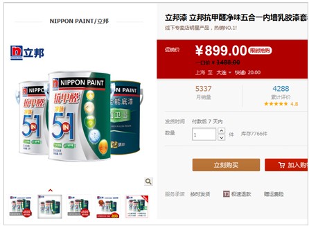 在雙蛋節來臨之至,立邦漆將會很多的優惠,價錢更優,折扣更多。現在立邦漆的這款抗甲醛凈味五合一內墻乳膠漆套裝原價1488元現價是899元,據了解到雙蛋節將會有更多的降價。欲想了解的朋友們就要留意立邦涂料品牌的天貓網了。