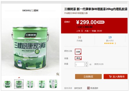 現在新一代康家凈味墻面漆天貓網售價是299元,比原價460元已經減少了161元,據了解到雙蛋節整個天貓商城三棵樹所有的產品將會有更多的打折優惠活動大放心,讓消費者買到實惠,滿足眾多人的消費需求。