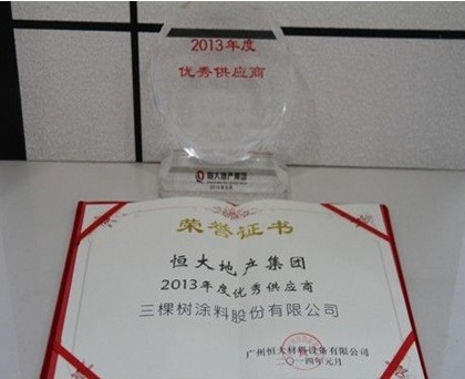 優質就是好 三棵樹漆連續四的被恒大地產選為優秀供應商。2014年2月20日,恒大地產供應商年會在廣州成功召開,在此次優透供應商的評選活動現場來自各行各業的56名供應商齊聚一堂共享歡慶時刻。而三棵樹漆這次也被評為“優秀涂料供應商”,這已是它四年蟬聯。