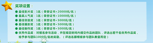 大賽將由網(wǎng)絡(luò)投票評選出最具人氣獎1名,獎金1萬元;還會由專家評審團(tuán)從選題、劇情、攝影、剪輯、音樂幾個方面進(jìn)行綜合評定,評選出最佳影片、最佳創(chuàng)意、最佳攝影、最佳制作、優(yōu)秀作品等多個獎項,多個獎項等你來PK!