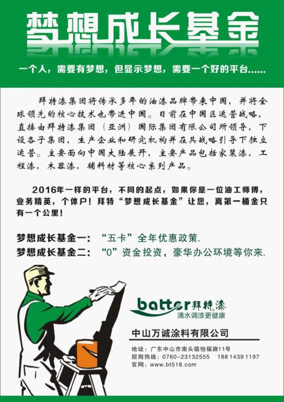 中國品牌網致力于中國全球化民族品牌的發展強大。提倡了解中國品牌,宣傳中國品牌,支持中國品牌。隨著中國經濟的日益發展,隨著中國民族經濟的日益強大,中國品牌將不斷發展中國民族品牌,為中國企業的發展加油吶喊。歡迎轉載分享本文“[2016拜特漆] 夢想成長基金