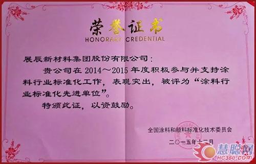 展辰集團憑借在國家標準、行業標準編寫和推廣工作中的優異表現,榮獲”2014-2015年涂料行業標準化行進單位”稱號。集團技術管理中心總經理劉志剛當選第七屆全國涂料和顏料標準化技術委員會SAC/TC5/SC7委員。