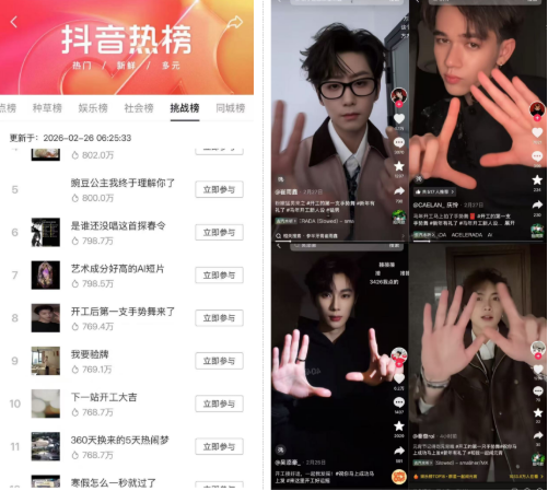 從聲量數據來看,#祝你馬上成功馬上發#抖音挑戰賽累計總播放量達77.5億,用戶投稿量超10萬,互動率(點贊+評論+轉發)超8%,遠超行業同類開工季挑戰賽平均水平;范丞丞首發的“我發搖”手勢舞視頻播放量超1億,點贊量470萬+,同時推動多位明星接力模仿,相關視頻累計播放量超3億;線下,全國多個城市的商場大屏自發播放手勢舞相關內容,形成了線上線下聯動的傳播熱潮。