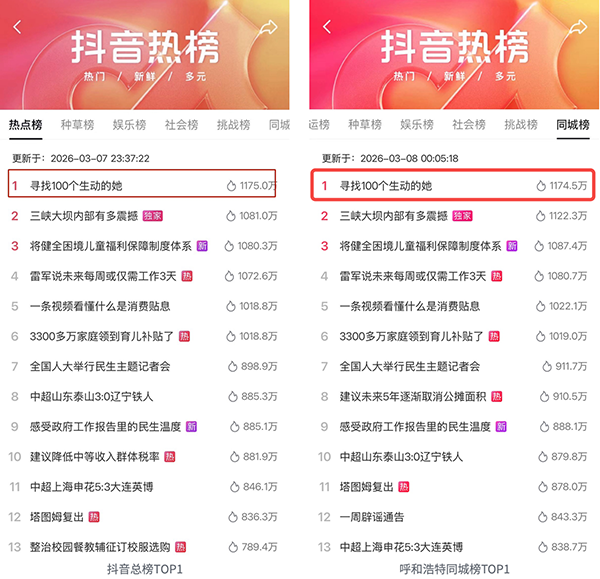 真實、無需修飾的日常記錄,天然契合女性用戶的表達欲,迅速點燃UGC創作熱潮。超100位達人參與,累計產出高贊視頻10個,話題斬獲抖音熱點榜TOP1。從“被看見”到“自我表達”,UGC讓“生動”成為千千萬萬女性共同書寫的集體敘事。