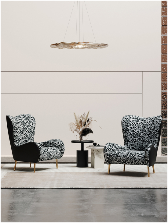 洛品有家參考安妮女王時期最具有代表性的安樂椅,并在此基礎上作出創新。這款休閑椅靠背與扶手相連,采用極繁主義的黑白印花,體現出洛品有家品牌深處的“輕柔嫵媚”。輕巧的腿,高高的靠背,兩側填翼并向前略略延伸,如女性的劉海和發冠,整體流暢舒適優雅。