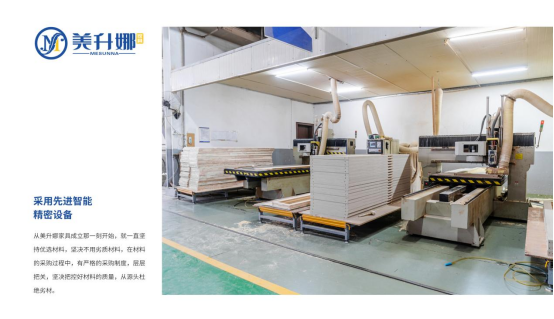 美升娜自建10萬平方米花園式工業園,打造集研發、生產、銷售、員工生活為一體的現代化標準廠房。面對互聯網+傳統行業時代趨勢,美升娜于2019年邁入工業4.0智造時代,提高生產制造能力,確保按時、按質、按量交付,滿足終端銷售需求。企業利用物聯網技術,建立各工序流程大數據信息共享平臺,實現生產和質量管理智能管理,將家具生產和質量管理做到精準、高效,并服務客戶遠程定制和下單。