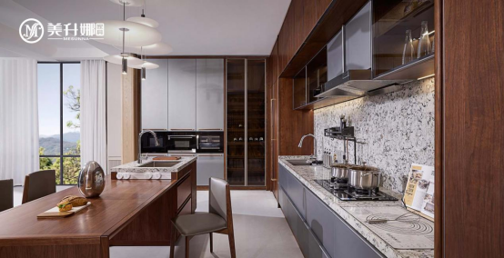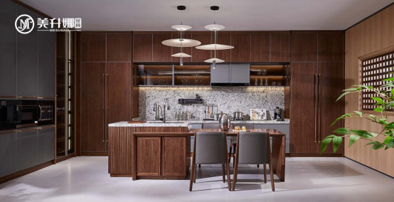在家的所有空間中,廚房是最能體現(xiàn)生活溫度的地方。這里既有柴米油鹽的瑣碎,也有親友相聚的熱鬧;既有油煙的喧囂,也有木質的沉靜。美升娜家具以北美黑胡桃木為材,在廚房空間里編織實用與美學的雙重奏,讓蒸騰的煙火氣與溫潤的木之韻在此共生共舞,將日常烹煮化作一場具象的生活藝術。