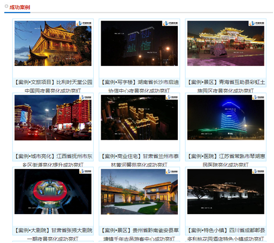 耕耘行業多年,靈創照明早已創下了眾多令業內人士震驚的好成績,特別是在亮化工程領域,其項目中標數量更是數不勝數。在官網的“成功案例”板塊,靈創照明便以圖文并茂的形象向網友展示了數目眾多的優秀案例,從文旅項目、景區、特色小鎮到城市亮化、商業住宅、星級酒店等領域應有盡有,燈光璀璨,風光迷人,保證讓網友大飽眼福。
