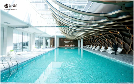 會場泳池區一半區域做了鋁天花,由上到下,由疏到密,具有光澤感的金屬裝飾打破空間的沉悶感,波浪和水滴的線條讓墻面栩栩如生。在不斷變換軌跡的太陽的照耀下,反射出一種光色漸變的效果,給路人以溫暖而柔軟的體驗,讓健身空間充滿生機與活力,讓人愛上游泳。